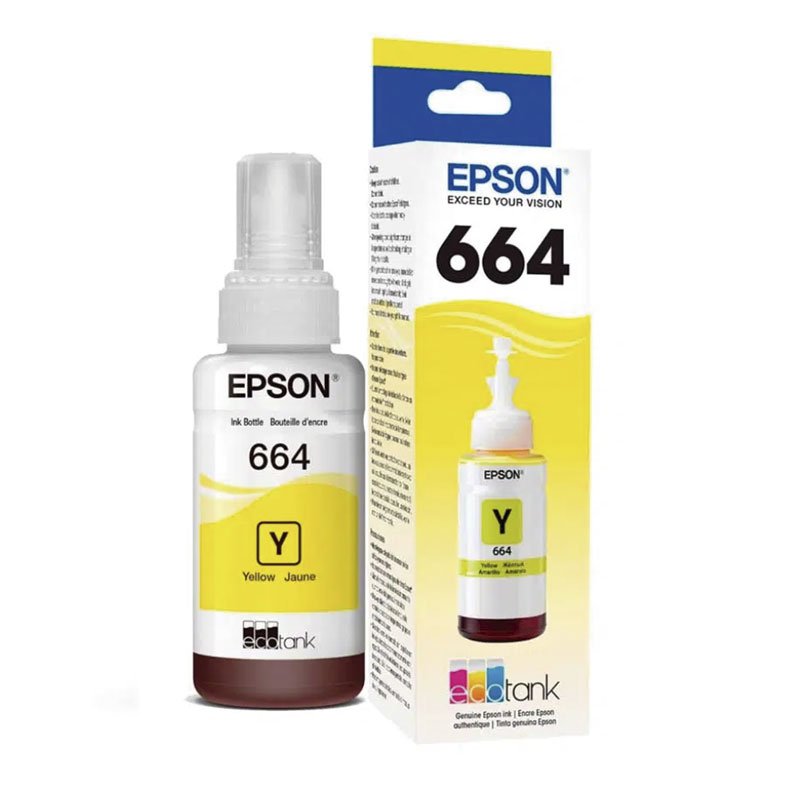 Marca: Epson. Modelo: T664. Color: amarillo. Contenido: 70 ml. Para equipos Epson EcoTank L850 / L575 / L310 / L365 / L455 / L395 / L200 / L565 / L380 / L475 / L375 / L495 / L110 / L1300 / L220.